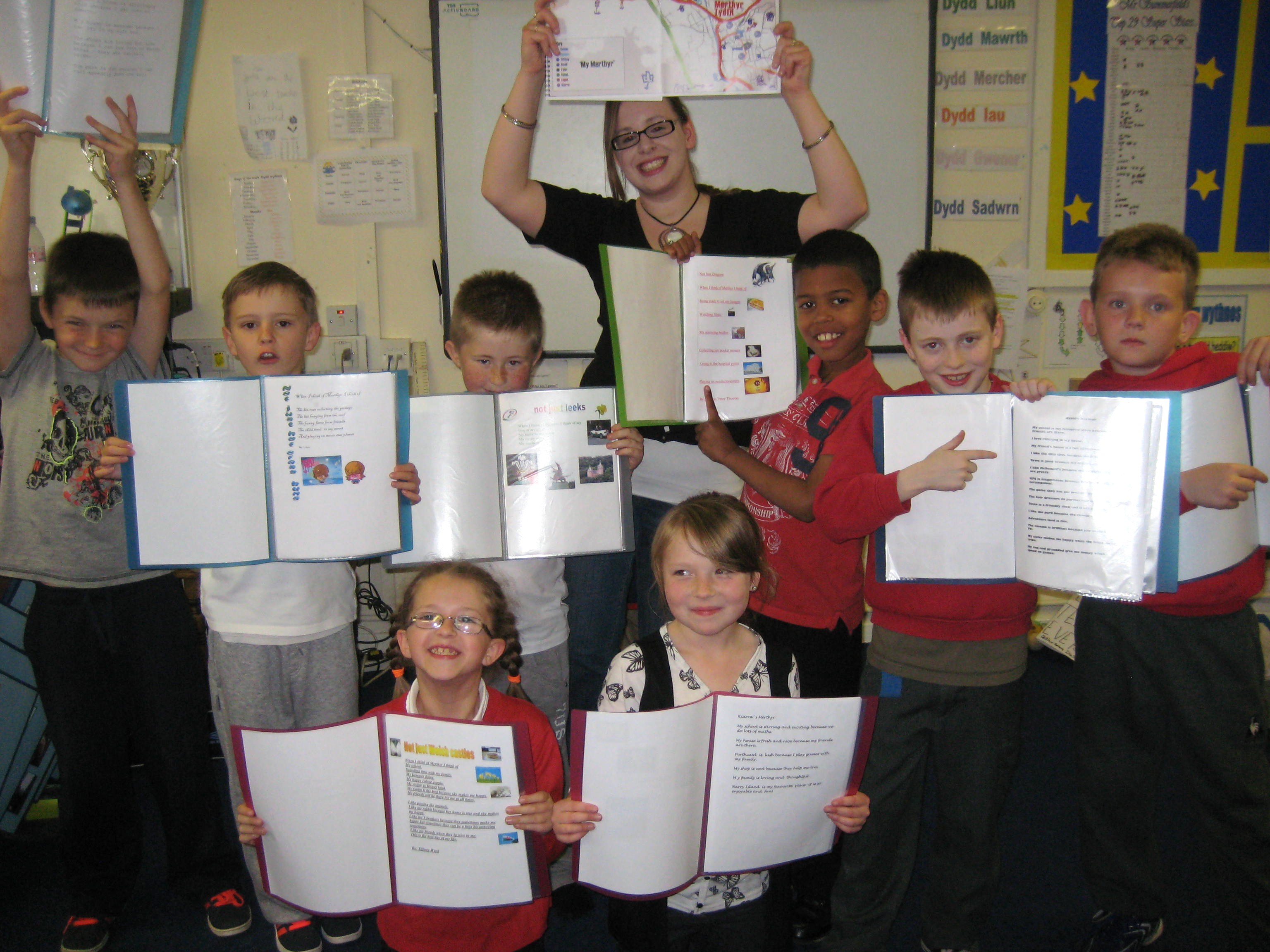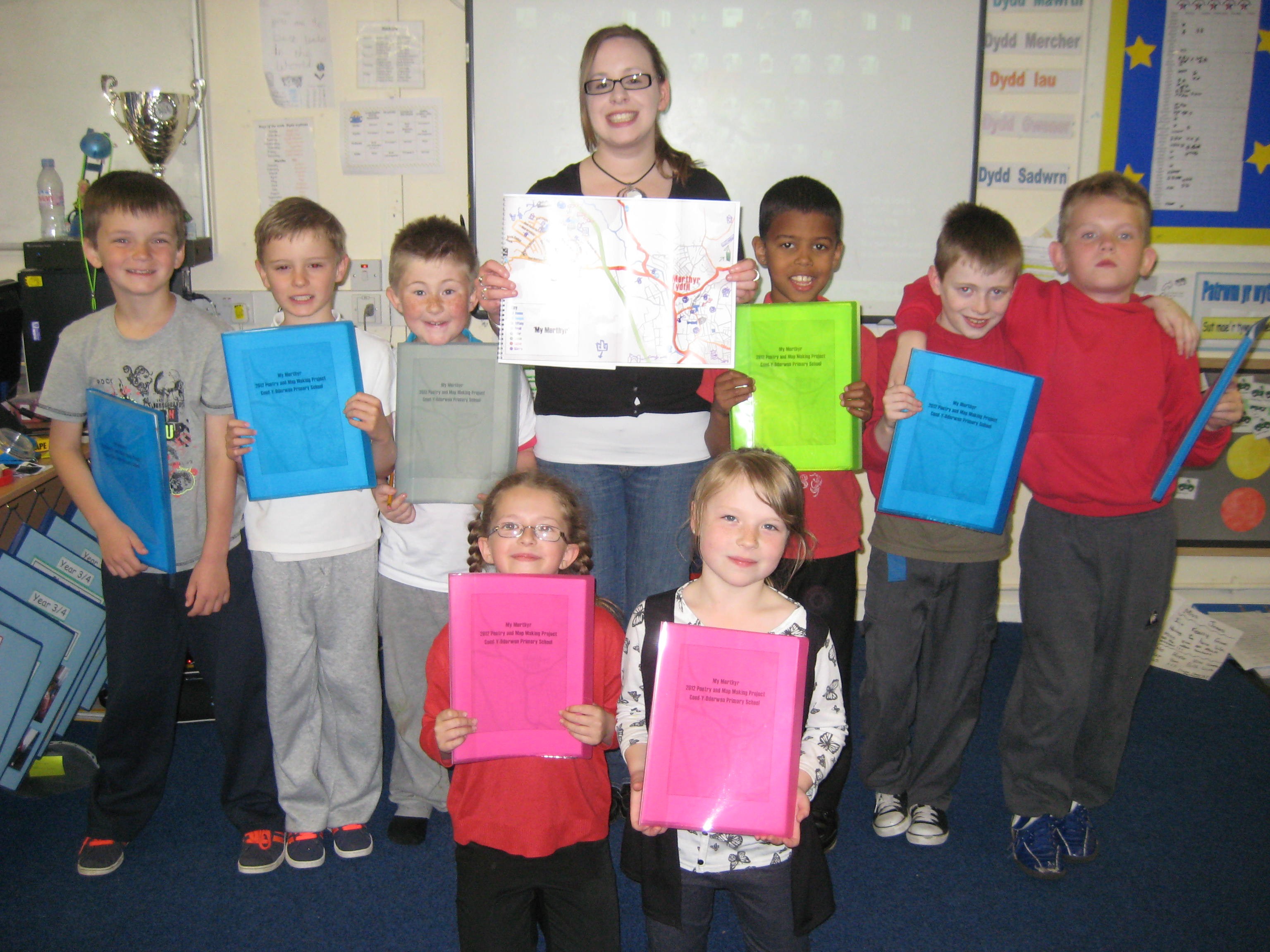 In addition to the published book, I collected each student’s work from the entire project into individual folders for them take home. These colorful packets — which were selected by the lovely Lisa Derrick — included their individual community-themed poem, ‘My Merthyr’ poem, original map, and a large pull-out map featuring symbols drawn by the whole group.